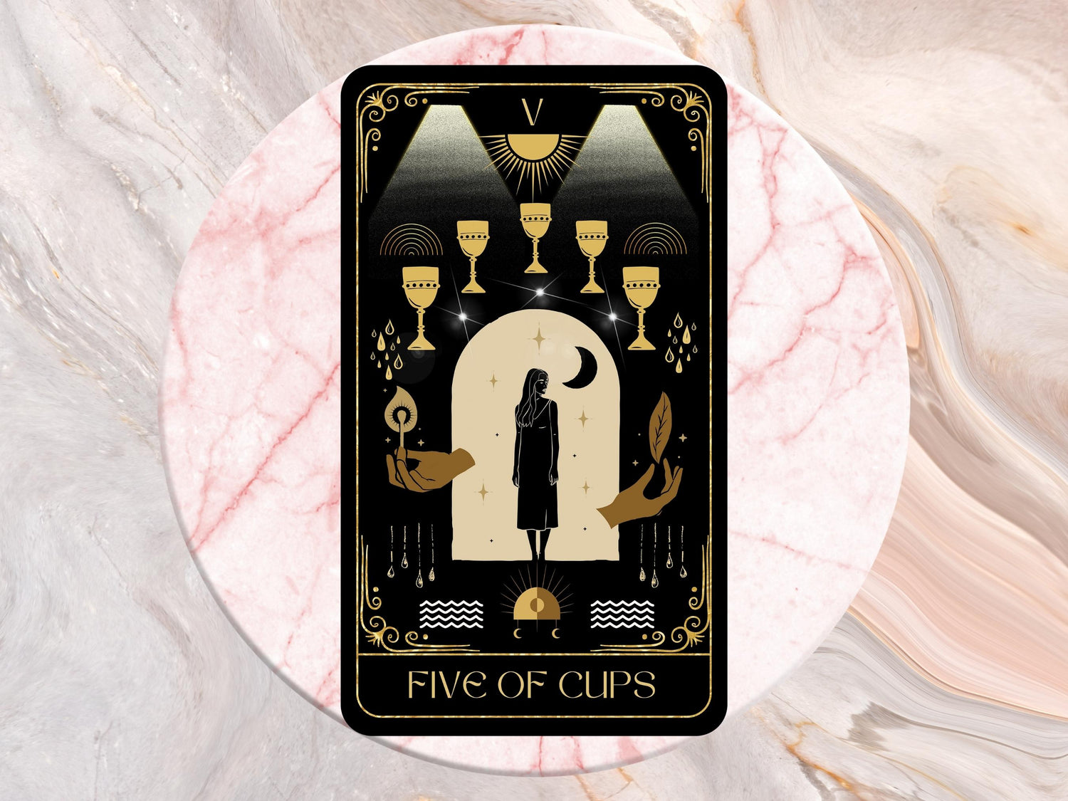 The Five of Cups represents grief, loss, and disappointment. It often refers to emotional pain and sorrow and it is associated with the negative feelings that arise when things do not go as planned.