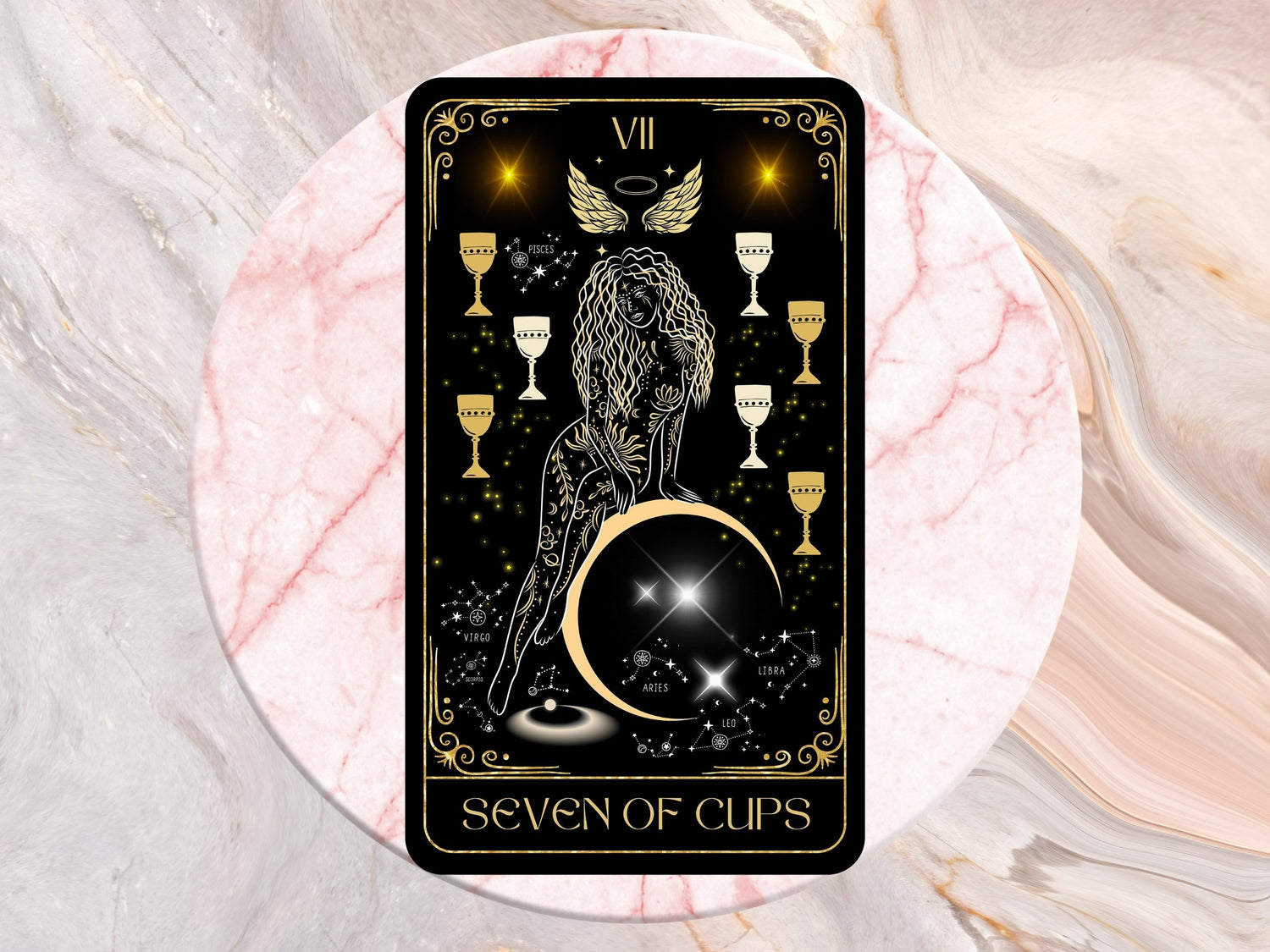 The Seven of Cups is a symbol of choices, illusions, and daydreaming. It means that you have many options and multiple possibilities available to you, but you may feel indecisive and live in a dream world of wishful thinking and illusion. The suit of Cups is associated with emotions, relationships, and intuition, making the Seven of Cups a card of emotional confusion and uncertainty.