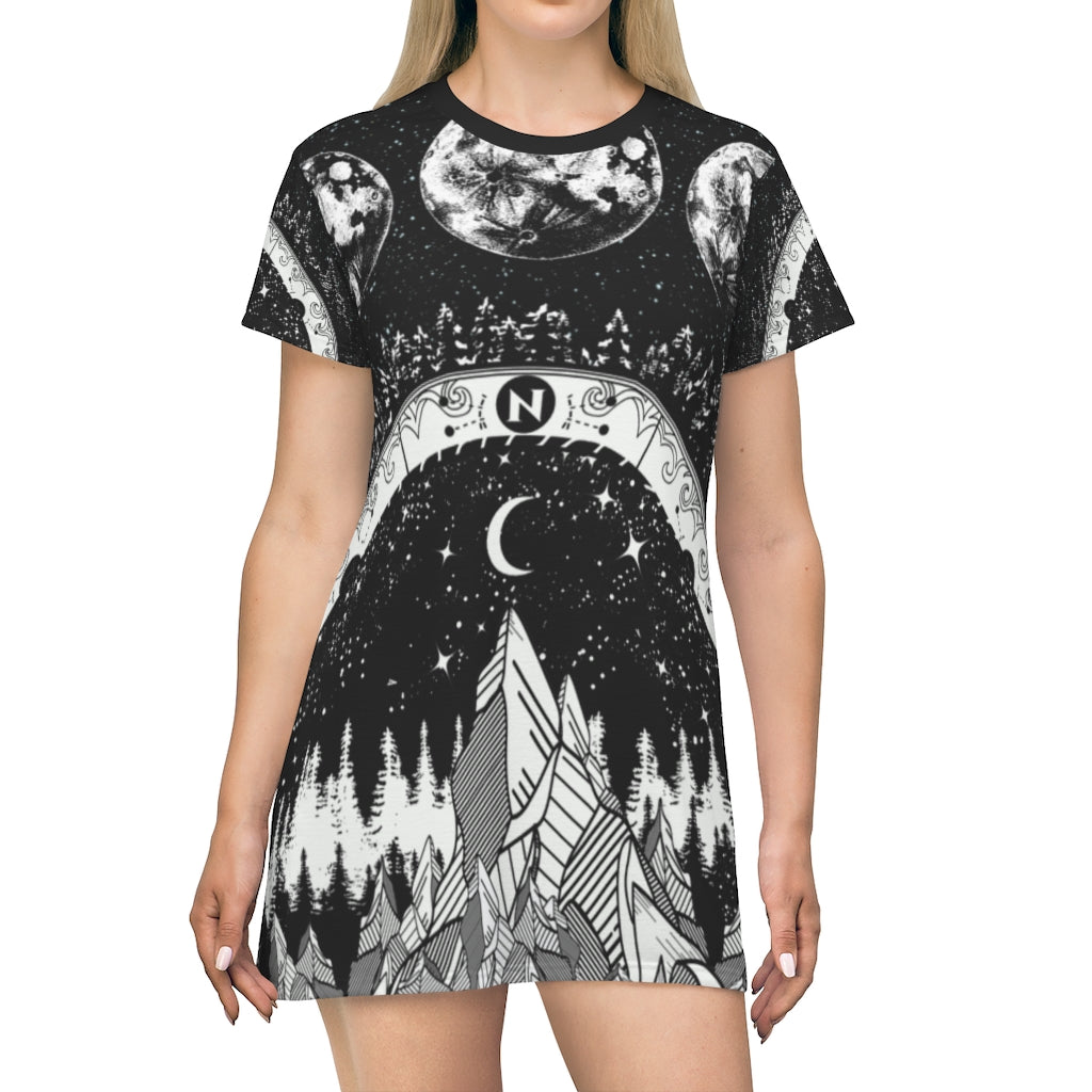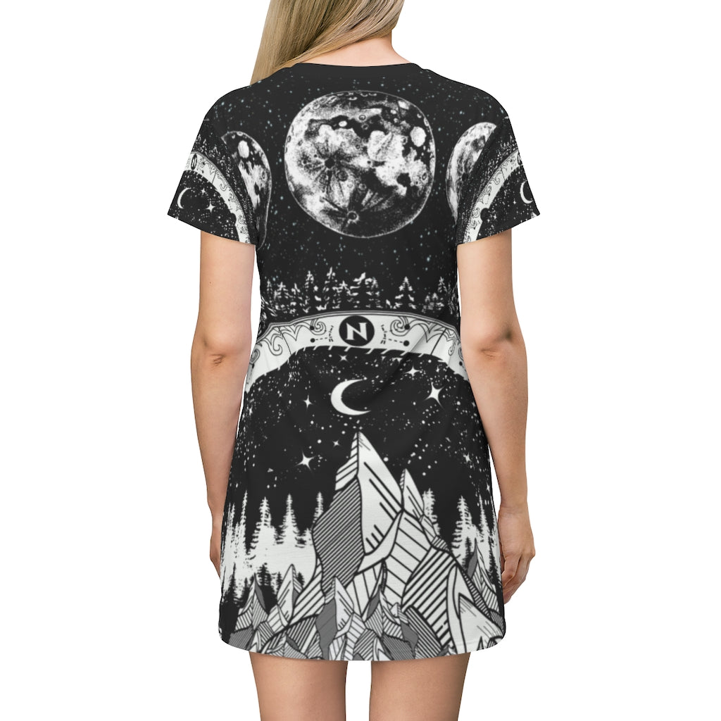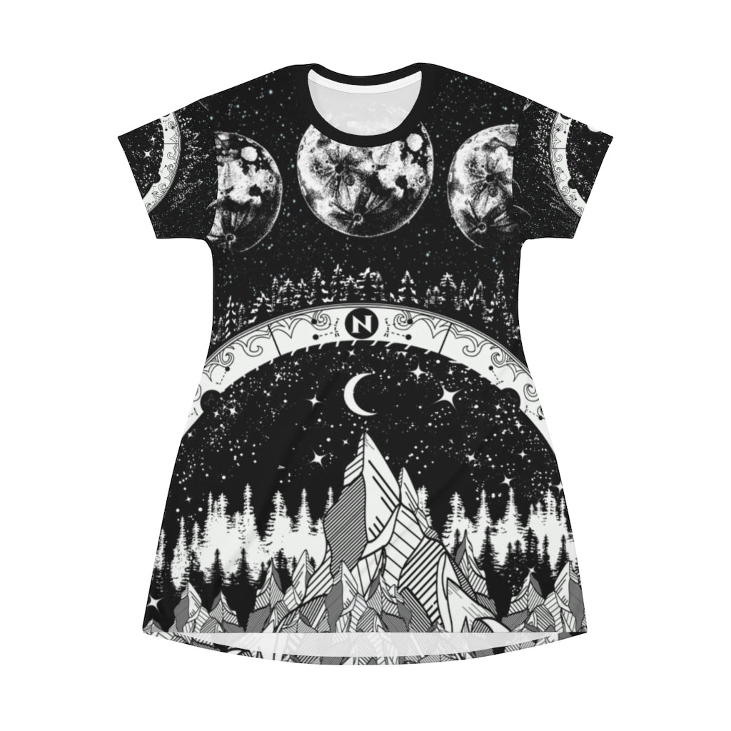Moon Phases Dress Black&White All Over Print T-Shirt Dress Grunge Dress Lunar Night Sky Starry Night Gothic Celestial Dress